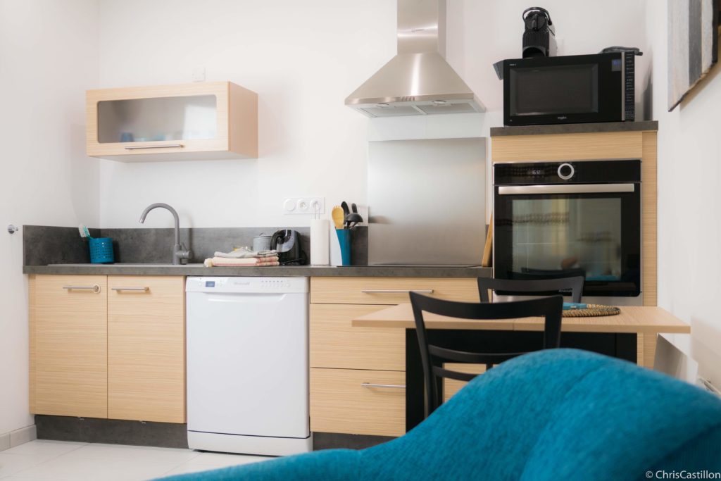 • une cuisine entièrement équipée (four, réfrigérateur/congélateur, plaque à induction, lave vaisselle, micro ondes, grille pain, machine à café Nespresso, bouilloire…)